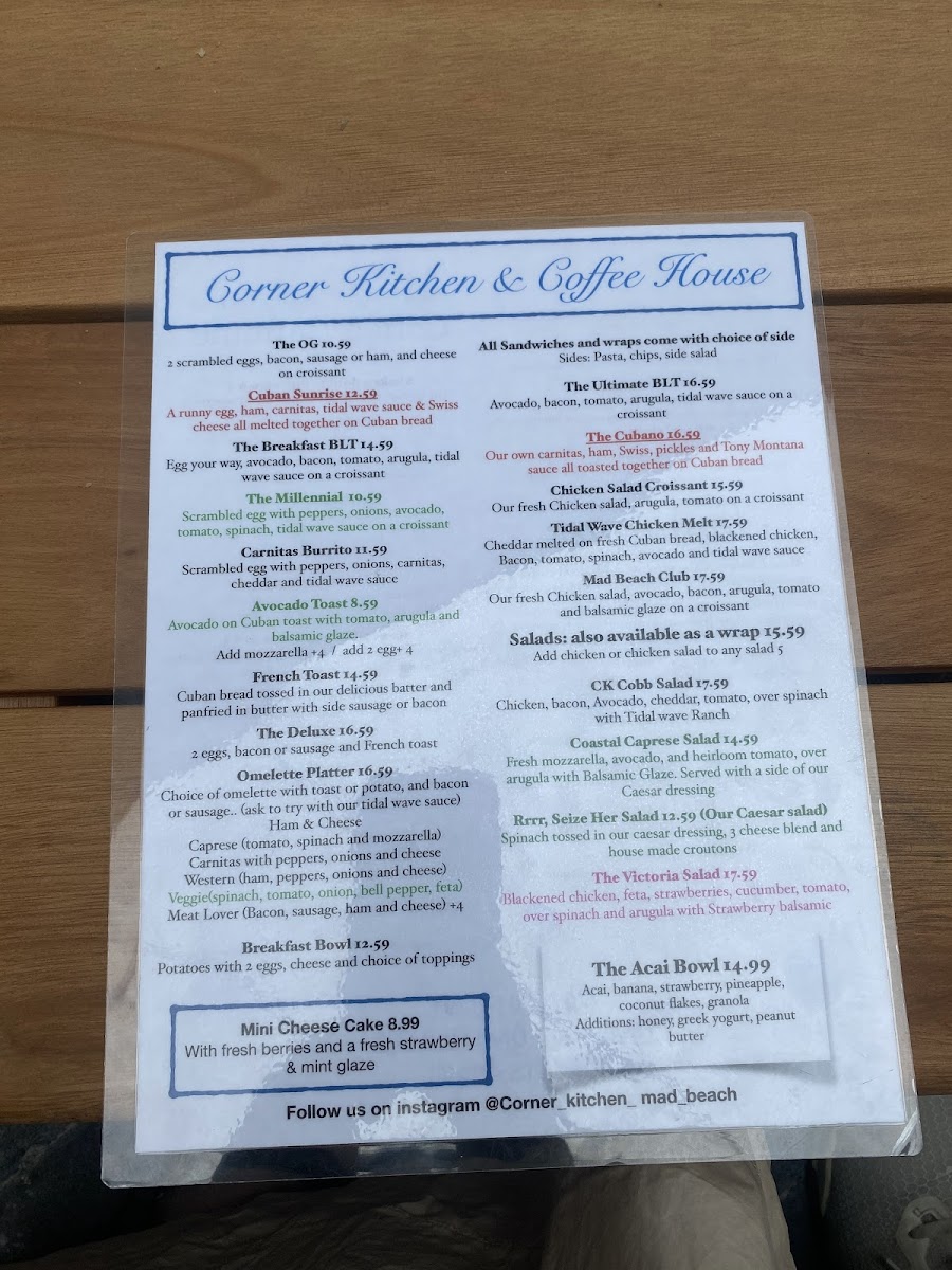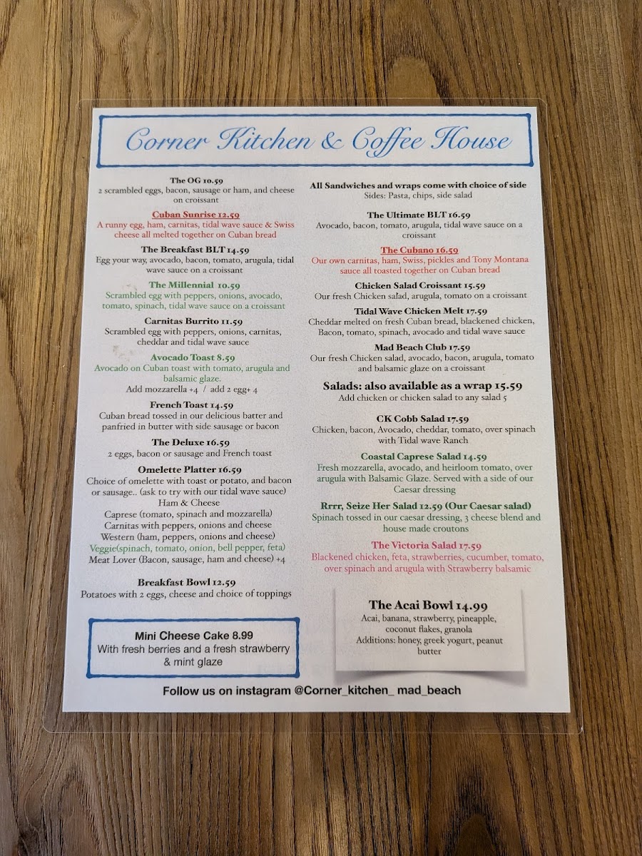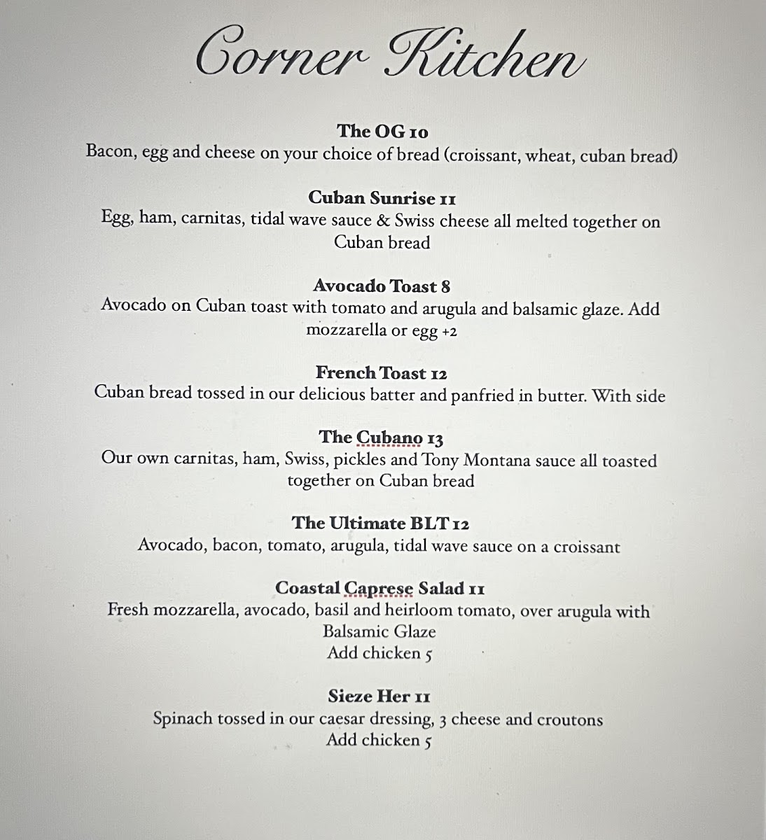 Corner Kitchen and Coffee House offers a delightful array of dishes catering to a variety of tastes. For those in the mood for something fresh, their Cobb Salad, Coastal Caprese Salad, and Seize Her Salad provide vibrant, flavor-packed options. If you're looking for something more indulgent, the Rrrr and Victoria Salad are perfect choices, alongside the refreshing Acai Bowl. For coffee lovers, the menu features a robust selection of beverages, including Shaken Doe Espresso, Iced Latte, and the classic Cappuccino, as well as chilled options like Iced Coffee and Latte. Kids can enjoy the simple yet satisfying Egg Platter, while heartier options like Cuban Sunrise and Avocado Toast serve as great choices for breakfast or brunch. If you're craving something savory, the Cubano and Ultimate BLT are standout items, with the Chicken Salad Croissant and Mad Beach Club adding variety to the menu. For something more filling, the Tidal Wave Chicken Melts provide a satisfying option for those looking for a hearty meal. With its diverse offerings, Corner Kitchen and Coffee House promises a satisfying dining experience for all.