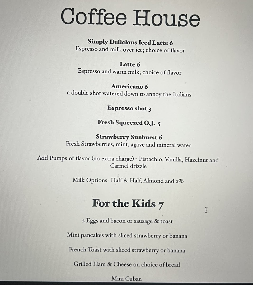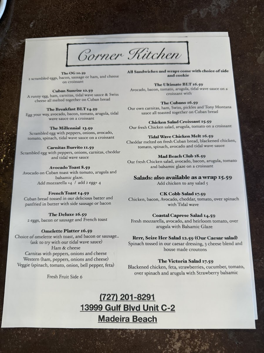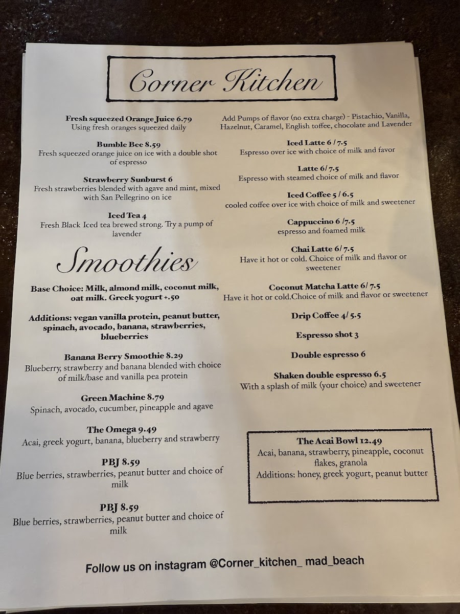 Corner Kitchen and Coffee House offers a delightful array of dishes catering to a variety of tastes. For those in the mood for something fresh, their Cobb Salad, Coastal Caprese Salad, and Seize Her Salad provide vibrant, flavor-packed options. If you're looking for something more indulgent, the Rrrr and Victoria Salad are perfect choices, alongside the refreshing Acai Bowl. For coffee lovers, the menu features a robust selection of beverages, including Shaken Doe Espresso, Iced Latte, and the classic Cappuccino, as well as chilled options like Iced Coffee and Latte. Kids can enjoy the simple yet satisfying Egg Platter, while heartier options like Cuban Sunrise and Avocado Toast serve as great choices for breakfast or brunch. If you're craving something savory, the Cubano and Ultimate BLT are standout items, with the Chicken Salad Croissant and Mad Beach Club adding variety to the menu. For something more filling, the Tidal Wave Chicken Melts provide a satisfying option for those looking for a hearty meal. With its diverse offerings, Corner Kitchen and Coffee House promises a satisfying dining experience for all.